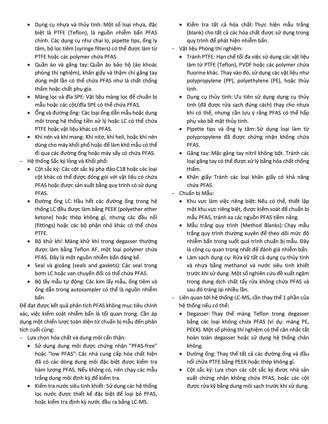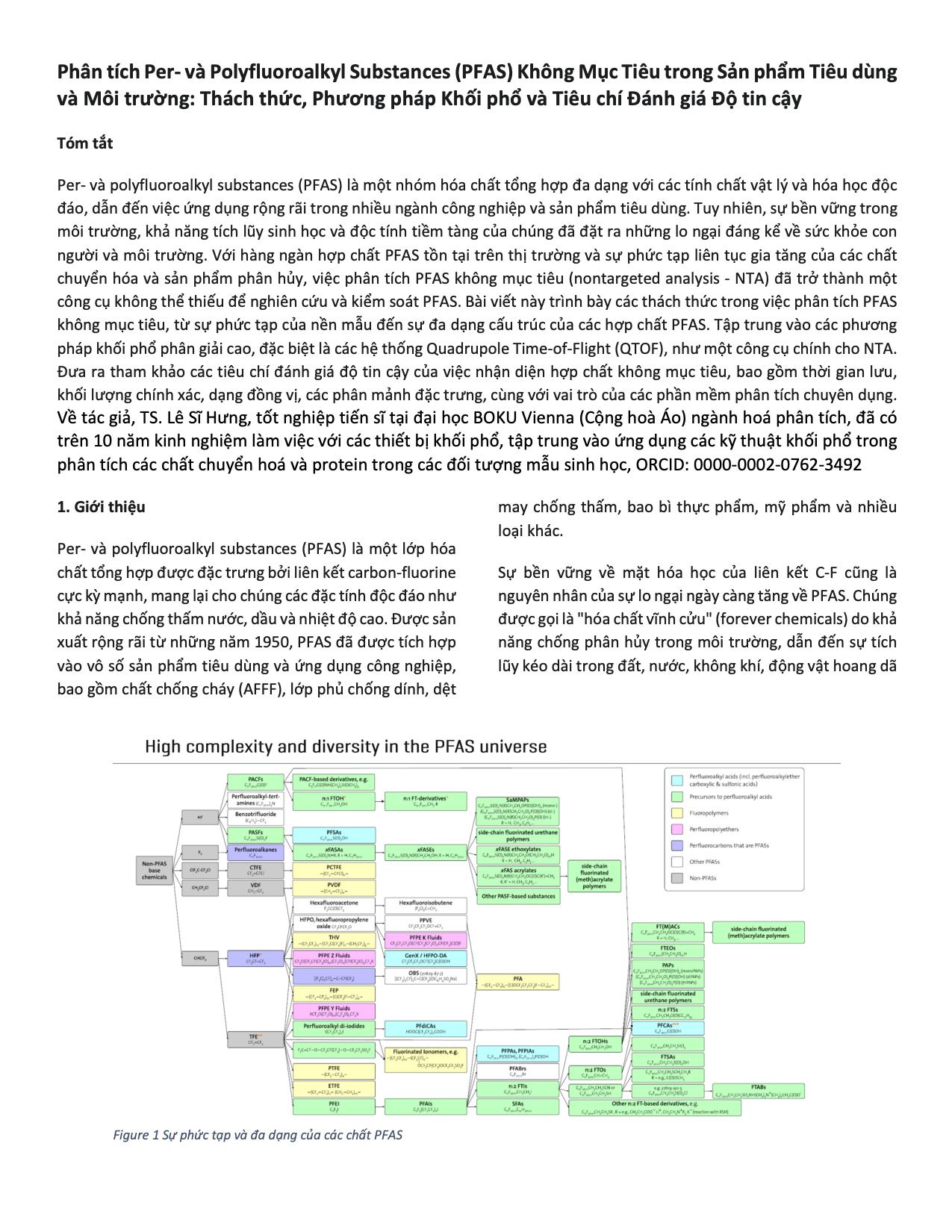 Per- và polyfluoroalkyl substances (PFAS) là một nhóm hóa chất tổng hợp đa dạng với các tính chất vật lý và hóa học độc đáo, dẫn đến việc ứng dụng rộng rãi trong nhiều ngành công nghiệp và sản phẩm tiêu dùng. Tuy nhiên, sự bền vững trong môi trường, khả năng tích lũy sinh học và độc tính tiềm tàng của chúng đã đặt ra những lo ngại đáng kể về sức khỏe con người và môi trường. Với hàng ngàn hợp chất PFAS tồn tại trên thị trường và sự phức tạp liên tục gia tăng của các chất chuyển hóa và sản phẩm phân hủy, việc phân tích PFAS không mục tiêu (nontargeted analysis - NTA) đã trở thành một công cụ không thể thiếu để nghiên cứu và kiểm soát PFAS. Bài viết này trình bày các thách thức trong việc phân tích PFAS không mục tiêu, từ sự phức tạp của nền mẫu đến sự đa dạng cấu trúc của các hợp chất PFAS. Tập trung vào các phương pháp khối phổ phân giải cao, đặc biệt là các hệ thống Quadrupole Time-of-Flight (QTOF), như một công cụ chính cho NTA. Đưa ra tham khảo các tiêu chí đánh giá độ tin cậy của việc nhận diện hợp chất không mục tiêu, bao gồm thời gian lưu, khối lượng chính xác, dạng đồng vị, các phân mảnh đặc trưng, cùng với vai trò của các phần mềm phân tích chuyên dụng. Về tác giả, TS. Lê Sĩ Hưng, tốt nghiệp tiến sĩ tại đại học BOKU Vienna (Cộng hoà Áo) ngành hoá phân tích, đã có trên 10 năm kinh nghiệm làm việc với các thiết bị khối phổ, tập trung vào ứng dụng các kỹ thuật khối phổ trong phân tích các chất chuyển hoá và protein trong các đối tượng mẫu sinh học, ORCID: 0000-0002-0762-3492