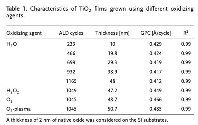 Các màng mỏng TiO2 được tổng hợp bằng hệ thống ALD (Beneq TFS-200). TDMAT đóng vai trò là tiền chất titan, trong khi nước khử ion ( H2O), hydro peroxit 50% khối lượng ( H2O2), O3 và plasma O2 được sử dụng làm các tác nhân oxy hóa. Các wafer Si (100) và sapphire (cung cấp bởi UniversityWafer) được sử dụng làm đế và được làm sạch bằng phương pháp rửa siêu âm trong cồn tuyệt đối (của Sigma Aldrich) và nước khử ion. Nhiệt độ buồng phản ứng được duy trì ở 200∘C cho tất cả các thí nghiệm, trong khi nhiệt độ của bình tiền chất TDMAT được thiết lập tại 60∘C. Khí mang cho quá trình ALD là N2 với nồng độ tạp chất O2 < 10−10 ppm (sử dụng bộ lọc Centorr model 2A), và áp suất làm việc bên trong buồng phản ứng dao động từ 1–2 mbar. Đối với quá trình tăng trưởng TiO2 có hỗ trợ plasma, khí Ar độ tinh khiết siêu cao đã được sử dụng làm khí mang.