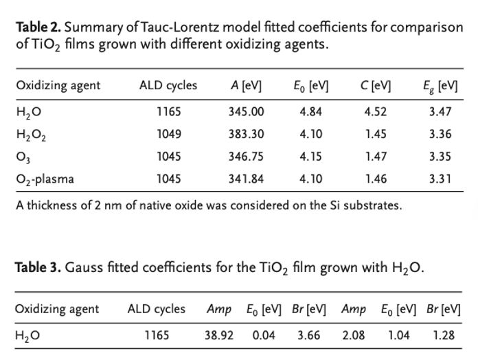 Màng TiO2 được tăng trưởng bằng tác nhân H2O cũng cần phải bổ sung một mạch dao động Gauss do các đặc tính quan sát được trong vùng cận hồng ngoại (NIR); khi đó, phần ảo của hàm điện môi được xác định bởi công thức: