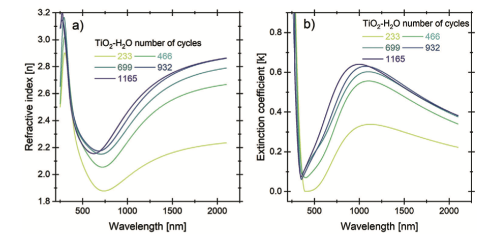 Hình 2 minh họa các hằng số quang học của TiO2 được tăng trưởng với H2O theo số chu kỳ ALD. Trong Hình 2a, chiết suất không thể hiện xu hướng nhất quán trong vùng tử ngoại (UV). Tuy nhiên, tại bước sóng 632 nm, chiết suất tăng tỉ lệ thuận với số chu kỳ, đạt giá trị cực đại là 2,18 trước khi giảm nhẹ xuống 2,15 đối với màng TiO2 dày nhất. Ngoài ra, chiết suất có xu hướng tăng khi tiến dần về vùng hồng ngoại, đạt đỉnh quanh mức 2100 nm và tăng dần theo số chu kỳ ALD. Tại bước sóng 2000 nm, các giá trị này tăng từ 2,28 lên 2,85 khi xét từ màng TiO2 mỏng nhất đến màng dày nhất.