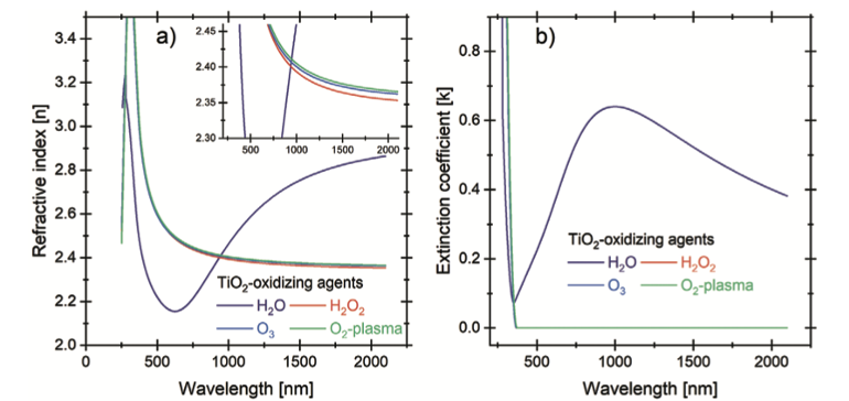 Hình 3 so sánh các hằng số quang học của các màng TiO2 được tổng hợp bằng các tác nhân oxy hóa khác nhau. Đồ thị (a) cho thấy, khác với mẫu TiO2 tăng trưởng bằng H2O, các màng TiO2 được chế tạo với H2O2, O3 và plasma O2 không biểu hiện sự gia tăng chiết suất trong vùng hồng ngoại (IR); thay vào đó, chúng thể hiện sự sụt giảm điển hình từ vùng UV sang IR. Tại bước sóng 632 nm, chiết suất của các màng tăng trưởng với H2O2, O3 và plasma O2 lần lượt là 2,483; 2,486 và 2,493 (xem inset). Hình 3b minh họa rằng các màng TiO2 được tăng trưởng với H2O2, O3 và plasma O2 thiếu vắng dải hấp thụ vốn xuất hiện trong màng tăng trưởng bằng H2O. Thay vào đó, chúng chỉ thể hiện sự hấp thụ vùng cấm (bandgap) của TiO2 , và độ hấp thụ này giảm dần khi bước sóng tăng lên.