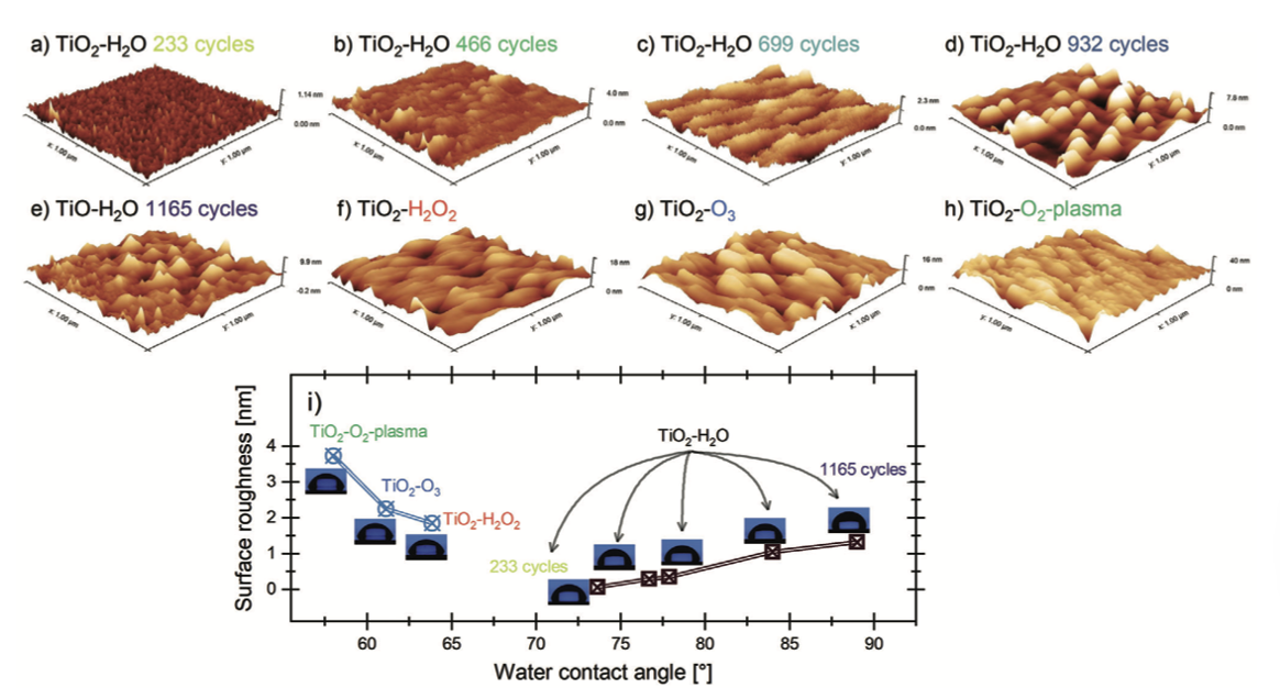 Hình 5i thể hiện mối tương quan giữa góc tiếp xúc của nước và độ nhám RMS của tất cả các màng TiO2. Đối với màng TiO2 tăng trưởng bằng H2O, tồn tại một mối quan hệ trực tiếp giữa góc tiếp xúc và độ nhám bề mặt, với màng dày nhất đạt góc tiếp xúc 89°. Ngược lại, các màng được chế tạo bằng H2O2, O3 và O2 plasma cho thấy góc tiếp xúc giảm dần, tương ứng là 63°, 61° và 58°.
