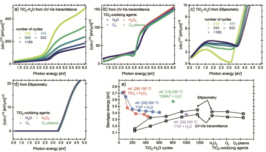 Hình 7a,b minh họa hệ số hấp thụ của các màng TiO2 được đo bằng phương pháp UV–vis. Kết quả cho thấy hấp thụ vùng cấm của TiO2 tăng trưởng bằng H2O tăng dần khi số chu kỳ ALD tăng lên, từ 3,13 eV đối với màng mỏng nhất đến 3,38 eV đối với màng dày nhất; trong khi đó, giá trị này lại giảm đối với các màng sử dụng các tác nhân oxy hóa khác, từ 3,36 eV ( H2O2) xuống 3,34 eV ( O3 ) và 3,33 eV (plasma O2). Mặt khác, Hình 7c,d trình bày hệ số hấp thụ được tính toán từ phép đo ellipsometry. Các hình này phản ánh xu hướng tương tự như kết quả độ truyền qua UV–vis nhưng với các giá trị cao hơn một chút. Năng lượng vùng cấm tăng từ 3,16 eV (màng mỏng nhất) lên 3,45 eV (màng dày nhất) đối với mẫu dùng H2O, trong khi giảm từ 3,42 eV ( H2O2 ) xuống 3,41 eV (O3) và 3,39 eV (plasma O2 ) đối với các mẫu khác. Ngoài ra, đáng chú ý là do dải đo rộng hơn, dải hấp thụ quan sát được trong mẫu TiO2 dùng H2Ocó bờ hấp thụ (band edge) tại khoảng ≈0,23 eV.