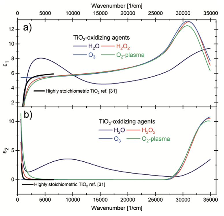 Ngoài ra, Hình 8 cho thấy các thành phần thực và ảo của độ điện thẩm (permittivity) chiết tách được, ε1 và ε2. Các giá trị này được rút ra từ việc khớp mô hình với dữ liệu ellipsometry, so sánh đáp ứng điện môi của các màng TiO2 tăng trưởng bằng H2O, H2O2,O3 và plasma O2 . Phép đo từ nghiên cứu của Kischkat và cộng sự trên TiO2 phún xạ đạt tính hợp thức hoàn toàn cũng được đưa vào để phân tích toàn diện các đặc tính điện môi. Hành vi tương tự như trong Hình 3 cũng xuất hiện ở đây; tuy nhiên, dải đo rộng hơn hiện nay cho phép quan sát cả bờ hấp thụ hoàn chỉnh đặc trưng của TiO2 dùng H2O và điểm khởi phát (onset) của dải hấp thụ. Điểm khởi phát này tương ứng với mode dao động ngang/dọc có đối xứng Eu trong các liên kết Ti−O.