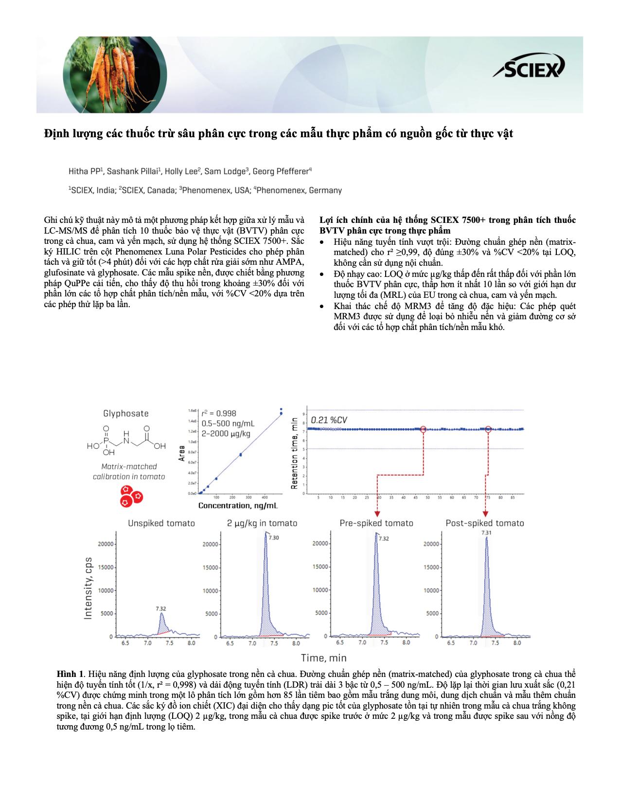 Ghi chú kỹ thuật này mô tả một phương pháp kết hợp giữa xử lý mẫu và LC-MS/MS để phân tích 10 thuốc bảo vệ thực vật (BVTV) phân cực trong cà chua, cam và yến mạch, sử dụng hệ thống SCIEX 7500+. Sắc ký HILIC trên cột Phenomenex Luna Polar Pesticides cho phép phân tách và giữ tốt (>4 phút) đối với các hợp chất rửa giải sớm như AMPA, glufosinate và glyphosate. Các mẫu spike nền, được chiết bằng phương pháp QuPPe cải tiến, cho thấy độ thu hồi trong khoảng ±30% đối với phần lớn các tổ hợp chất phân tích/nền mẫu, với %CV <20% dựa trên các phép thử lặp ba lần.