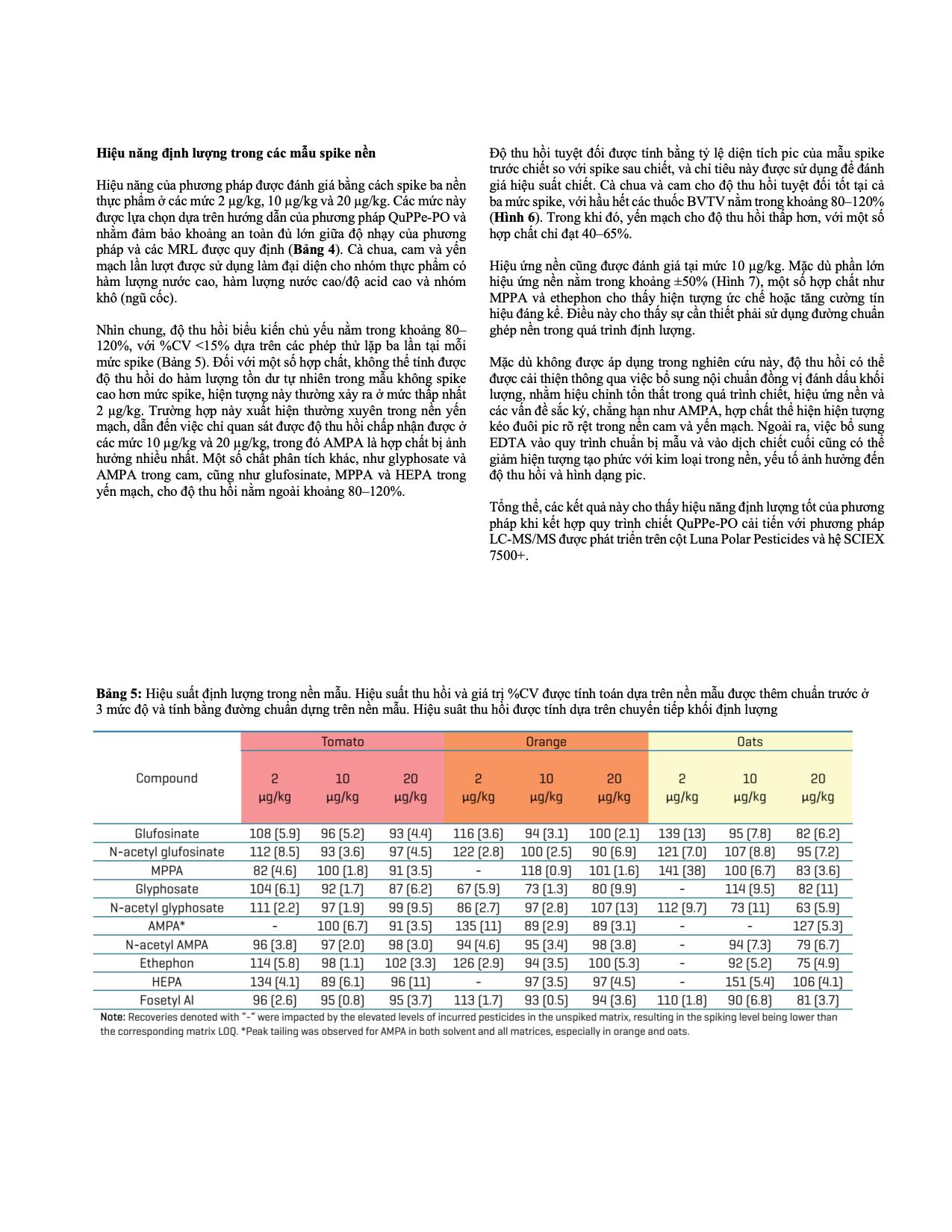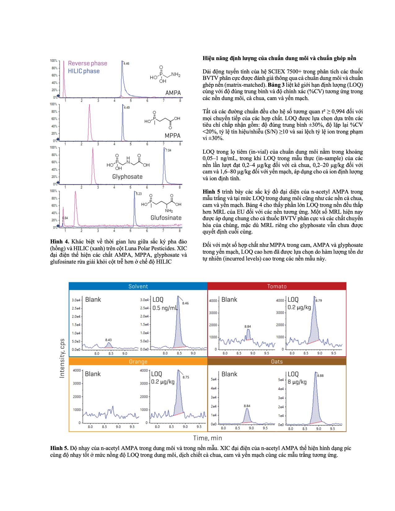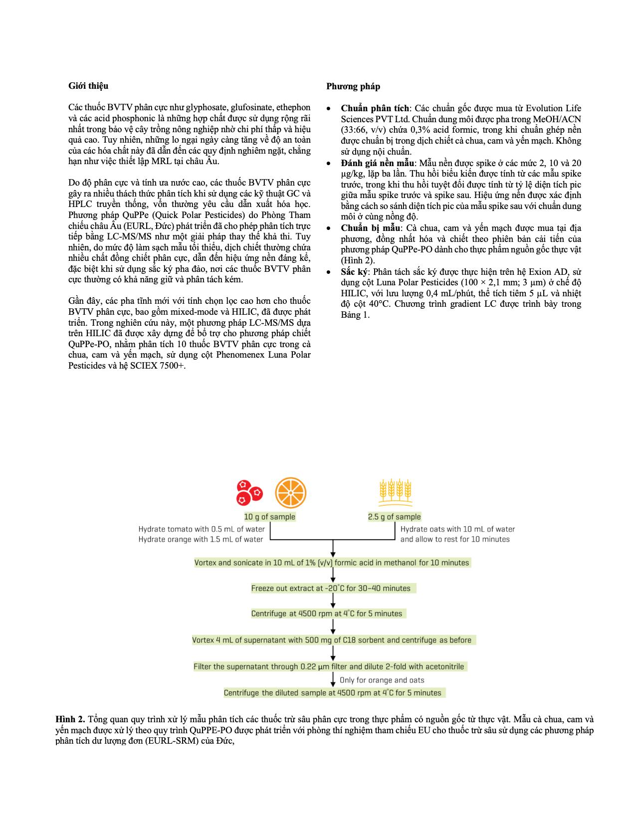 Gần đây, các pha tĩnh mới với tính chọn lọc cao hơn cho thuốc BVTV phân cực, bao gồm mixed-mode và HILIC, đã được phát triển. Trong nghiên cứu này, một phương pháp LC-MS/MS dựa trên HILIC đã được xây dựng để bổ trợ cho phương pháp chiết QuPPe-PO, nhằm phân tích 10 thuốc BVTV phân cực trong cà chua, cam và yến mạch, sử dụng cột Phenomenex Luna Polar Pesticides và hệ SCIEX 7500+.