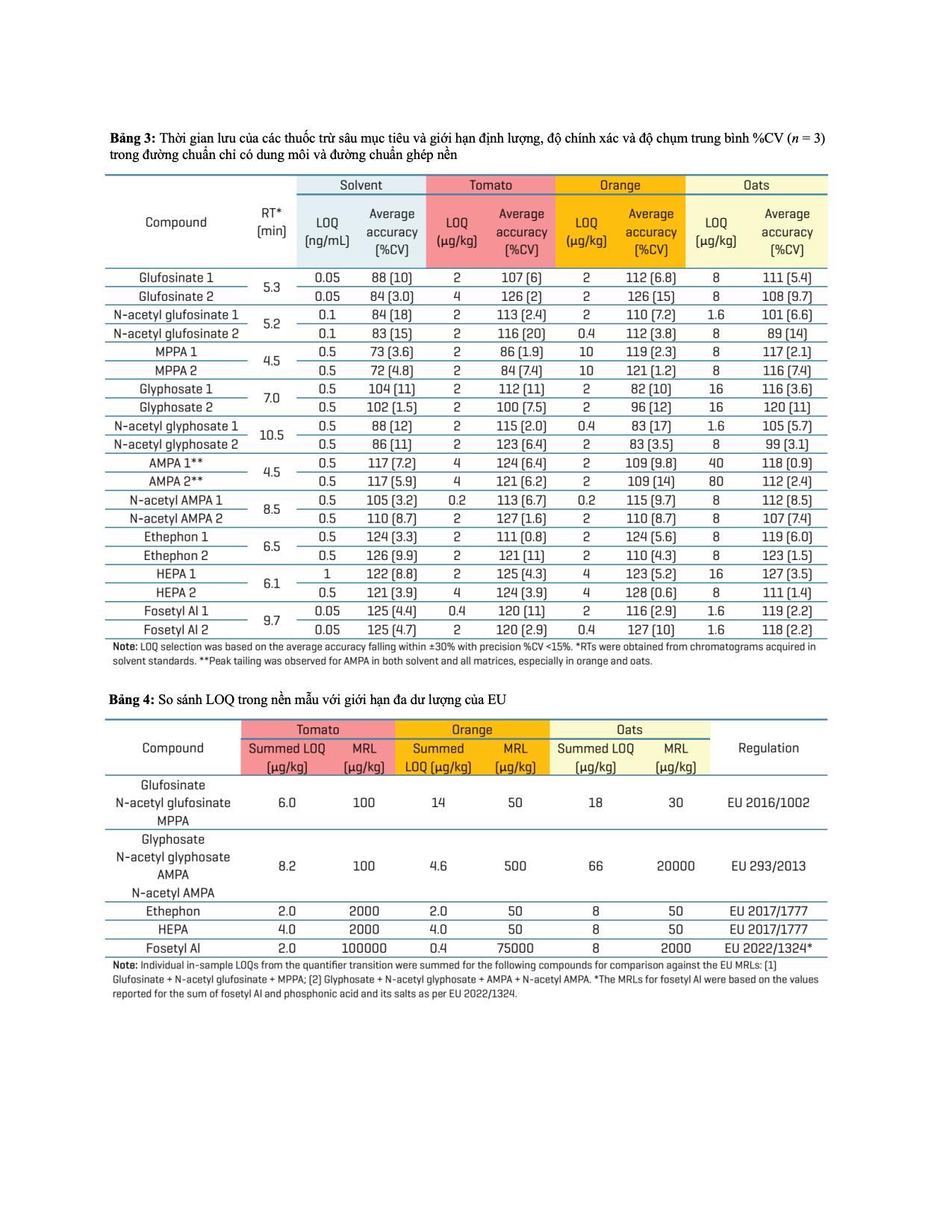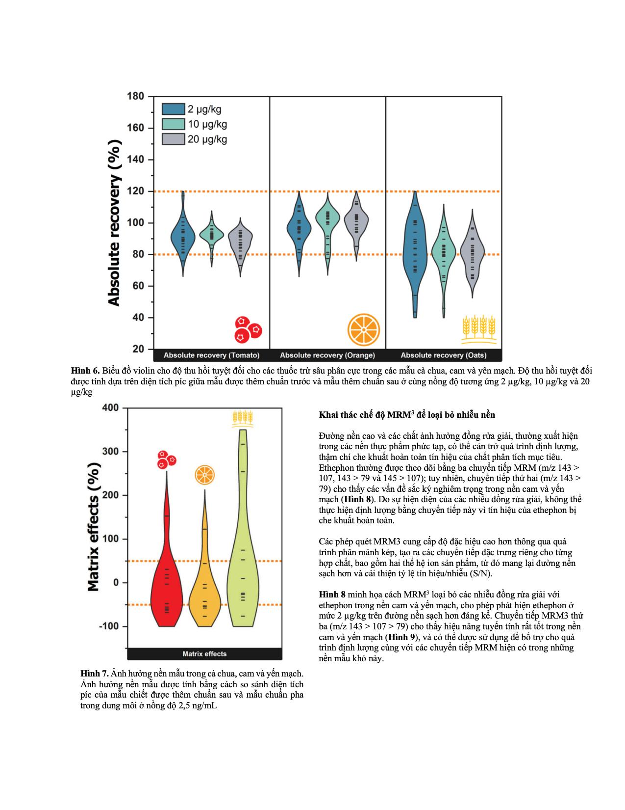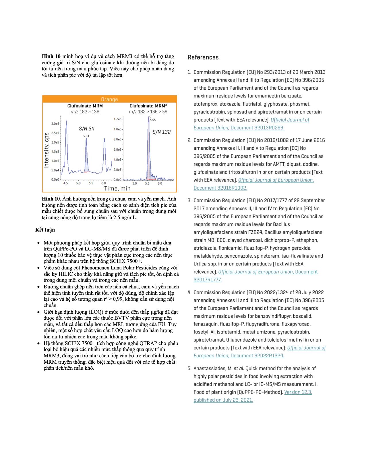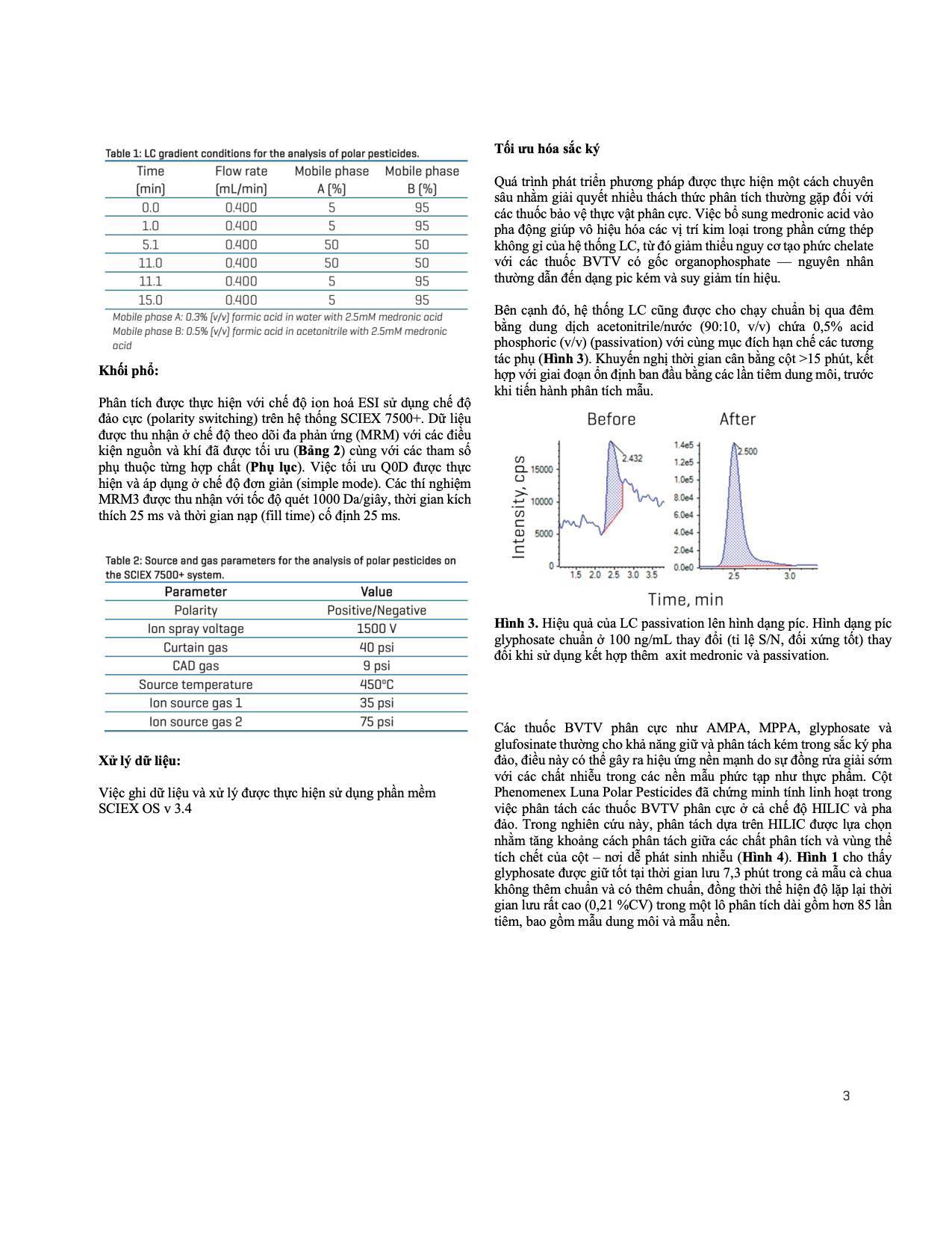 Gần đây, các pha tĩnh mới với tính chọn lọc cao hơn cho thuốc BVTV phân cực, bao gồm mixed-mode và HILIC, đã được phát triển. Trong nghiên cứu này, một phương pháp LC-MS/MS dựa trên HILIC đã được xây dựng để bổ trợ cho phương pháp chiết QuPPe-PO, nhằm phân tích 10 thuốc BVTV phân cực trong cà chua, cam và yến mạch, sử dụng cột Phenomenex Luna Polar Pesticides và hệ SCIEX 7500+.