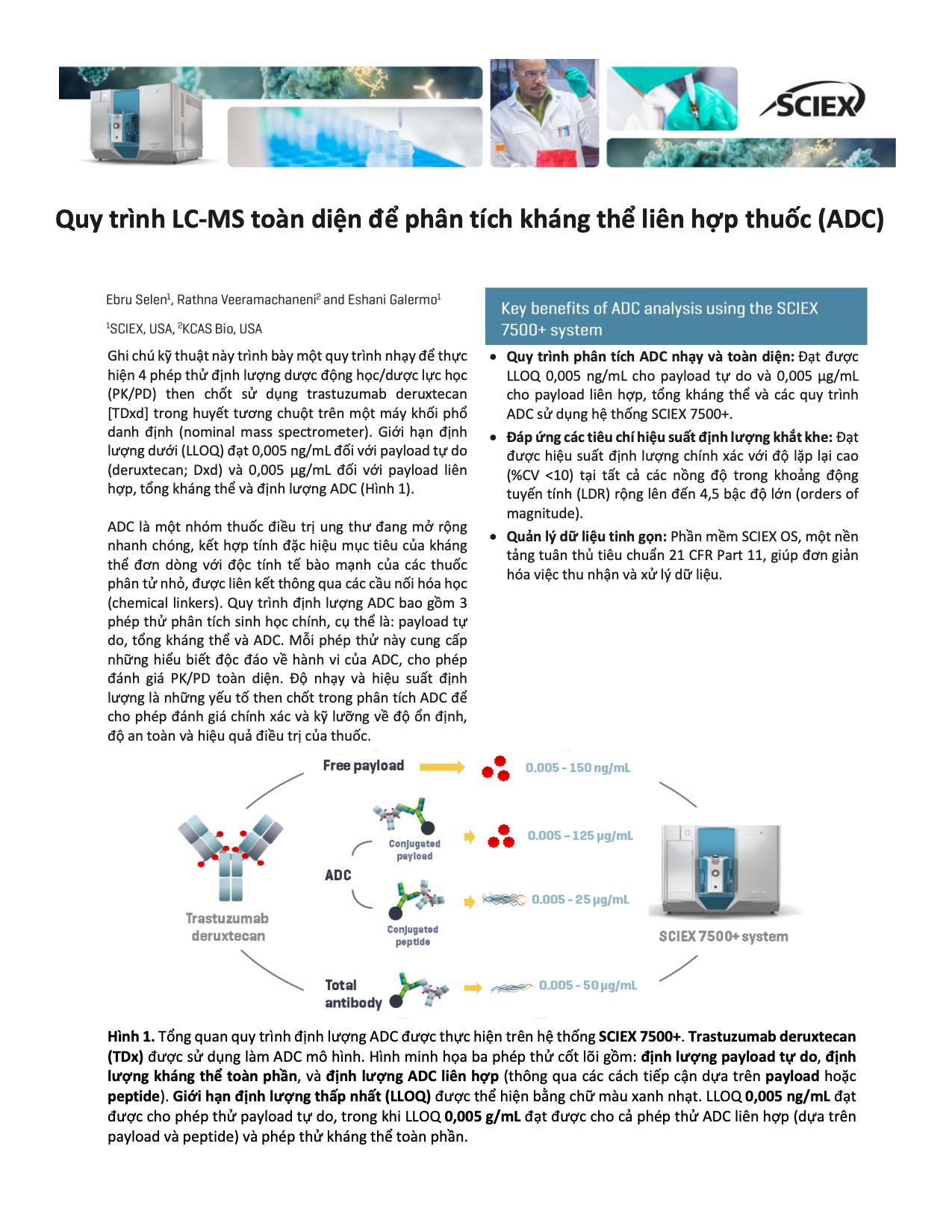 Kháng thể liên hợp thuốc (ADC) là các thuốc điều trị lai, liên kết một kháng thể đơn dòng với một payload gây độc tế bào thông qua một cầu nối hóa học. Mặc dù thiết kế này cho phép phân phối thuốc trúng đích đến các tế bào ung thư, nhưng nó cũng tạo ra những thách thức phân tích riêng biệt. Cần có các quy trình làm việc chuyên biệt để nắm bắt hành vi dược động học và dược lực học của từng thành phần trong ADC.