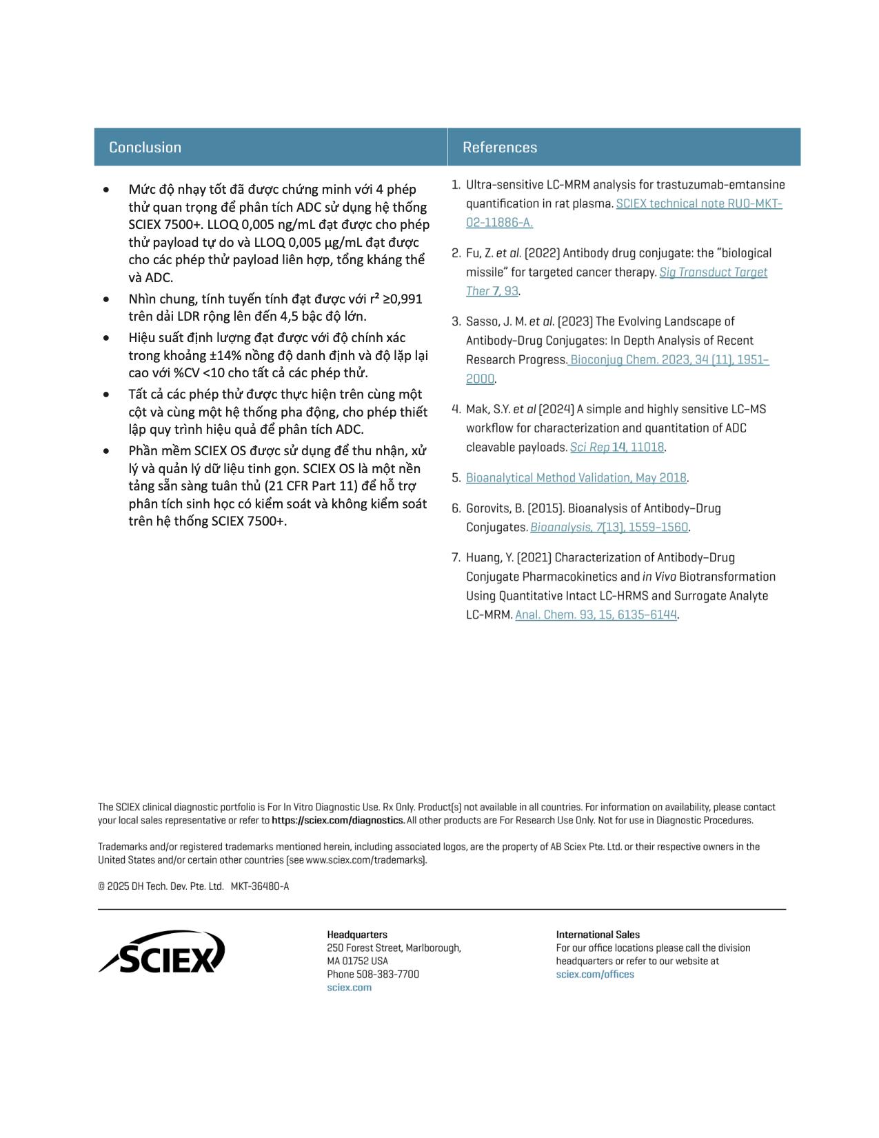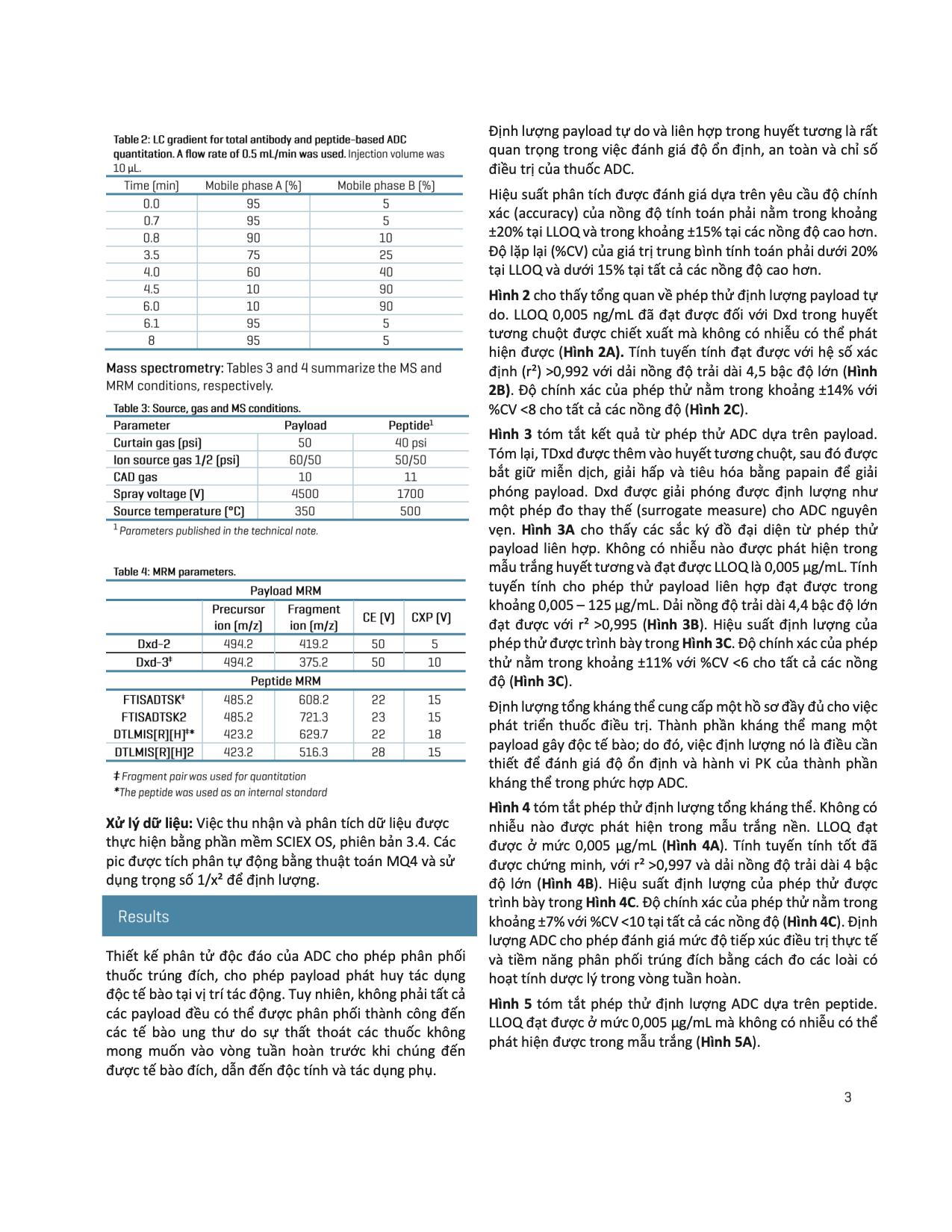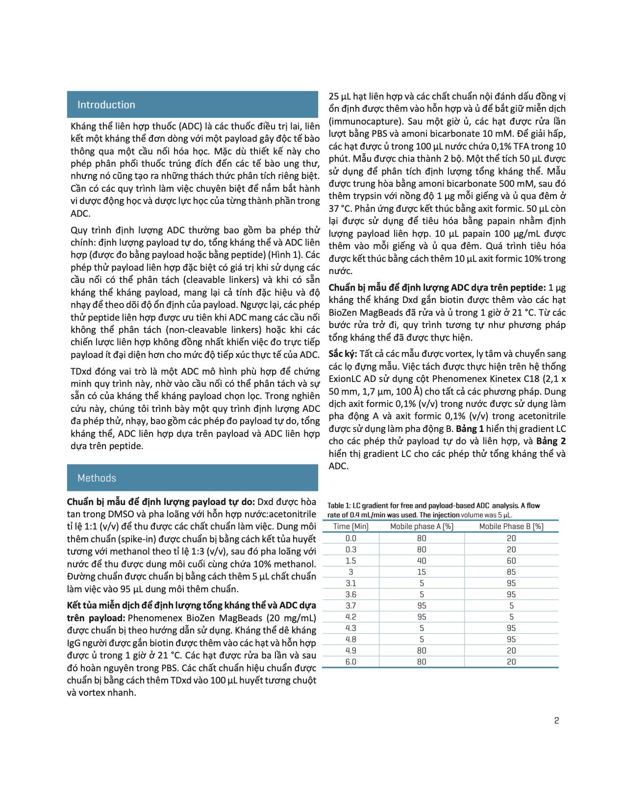 Sắc ký: Tất cả các mẫu được vortex, ly tâm và chuyển sang các lọ đựng mẫu. Việc tách được thực hiện trên hệ thống ExionLC AD sử dụng cột Phenomenex Kinetex C18 (2,1 x 50 mm, 1,7 µm, 100 Å) cho tất cả các phương pháp. Dung dịch axit formic 0,1% (v/v) trong nước được sử dụng làm pha động A và axit formic 0,1% (v/v) trong acetonitrile được sử dụng làm pha động B. Bảng 1 hiển thị gradient LC cho các phép thử payload tự do và liên hợp, và Bảng 2 hiển thị gradient LC cho các phép thử tổng kháng thể và ADC.
