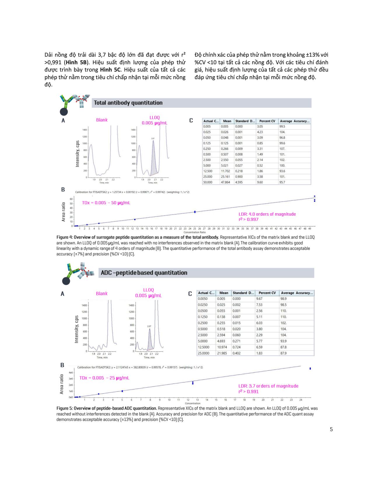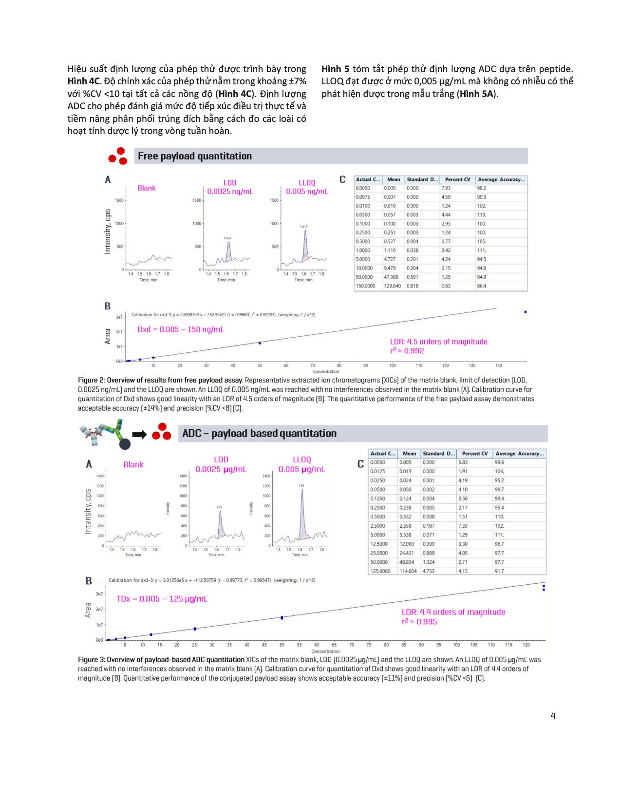TDxd đóng vai trò là một ADC mô hình phù hợp để chứng minh quy trình này, nhờ vào cầu nối có thể phân tách và sự sẵn có của kháng thể kháng payload chọn lọc. Trong nghiên cứu này, chúng tôi trình bày một quy trình định lượng ADC đa phép thử, nhạy, bao gồm các phép đo payload tự do, tổng kháng thể, ADC liên hợp dựa trên payload và ADC liên hợp dựa trên peptide.